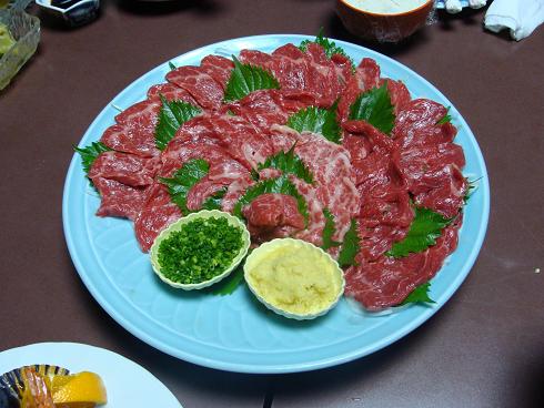 夕食は地のもの中心の料理だったが、お目当ては別注していた馬刺し4人前だ。赤身と霜降りの2種類が盛られている。馬刺しを肴に地元の米焼酎を飲むがこれが最高に馬かった。